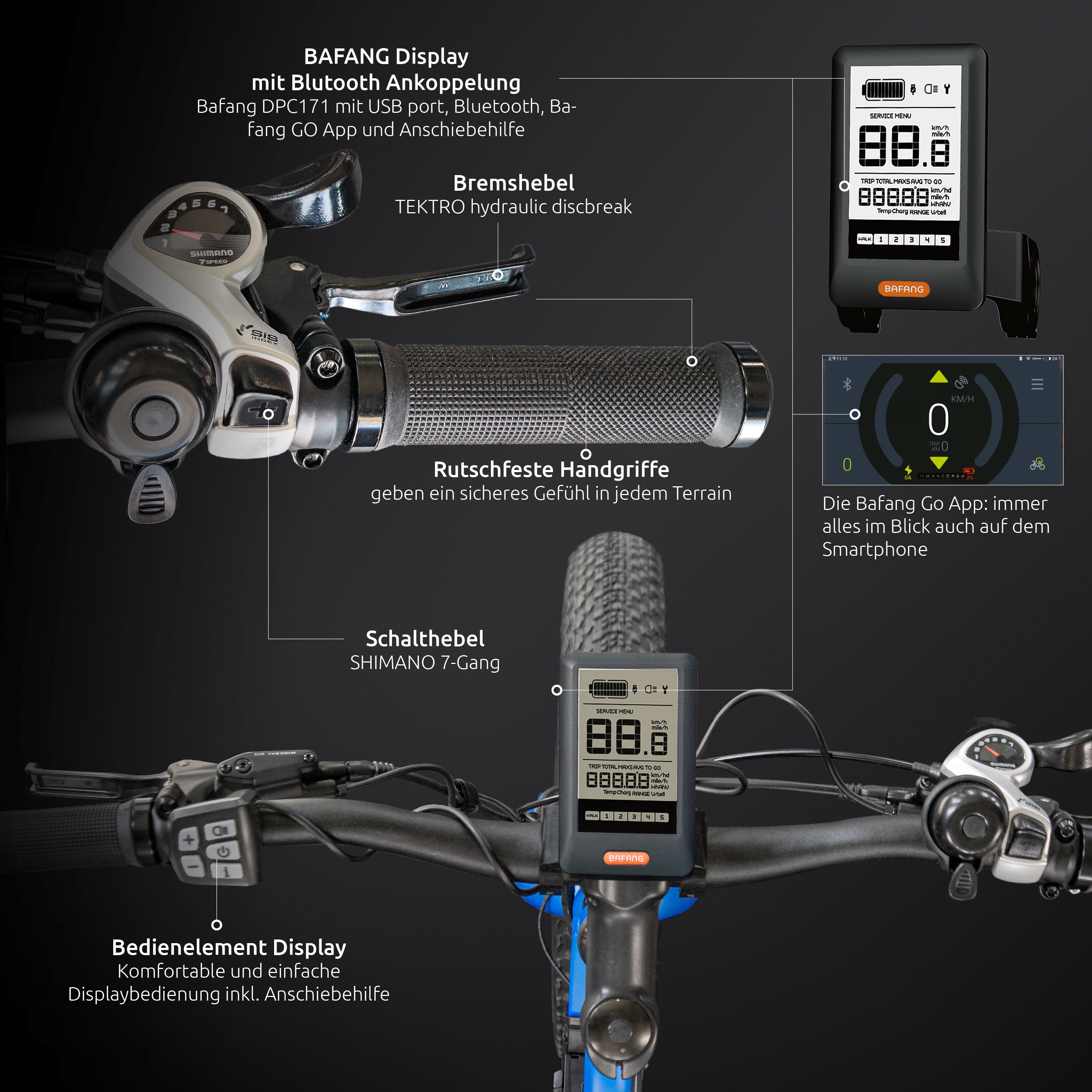 KMC 8-Speed Fahrradkette, hydraulische Federgabel von SR Suntour, hochwertige KENDA Fahrradreifen (20*4,0) und Display von BAFANG mit USB-Port, Bluetooth und Bafang Go App.